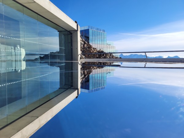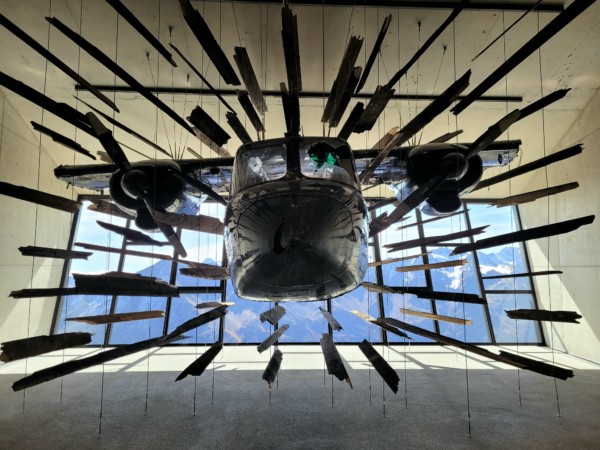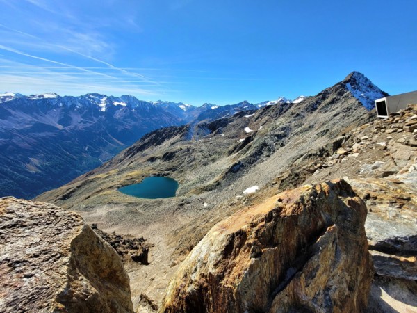 Fünfeinhalb Minuten später sind wir bereits an der Bergstation auf 3040 m ü. M. angekommen. Die Aussicht über das Bergpanorama ist atemberaubend. Die Sonne strahlt vom Himmel. Nur über dem Südtirol verhüllen dicke Wolken die Gipfel. Unsere Aufmerksamkeit gilt aber den architektonischen Meisterwerken! Dem komplett verglasten ice Q Restaurant und dem 007 ELEMENTS.