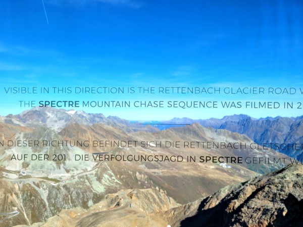 In der Ferne ist die Gletscherstrasse zu sehen, auf der nicht nur die Verfolgungsjagd stattgefunden hat. Lastwagen transportierten das Material zum Bau von 007 ELEMENTS bis auf 3048 m ü. M. 2017 war einer der stärksten Winter und die Temperaturen fielen bis auf minus 20 Celsius. Die offizielle Eröffnung fand darum auch erst im Juli 2018 statt.