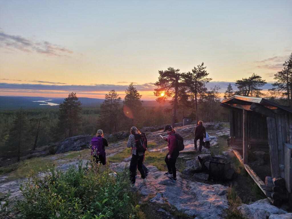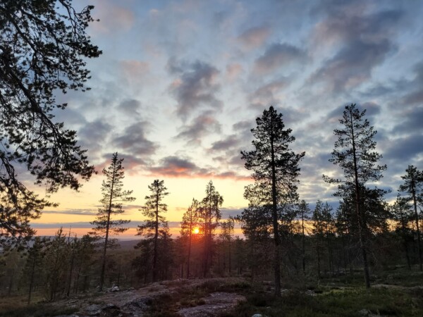 Danach ist ein Verdauungsspaziergang in der Natur angesagt. Es gibt in Rovaniemi keine hohen Berge, aber der Aussichtspunkt auf dem Hügel bietet einen herrlichen Blick in die schier endlose Weite. Unten im Tal schlängelt sich ein Fluss durch die Landschaft und am Horizont strahlt selbst um Mitternacht die Sonne im warmen Licht. Was für ein Kontrast zu meiner letzten Lappland-Reise im Winter, wo sie sich kaum am Himmel zeigte.