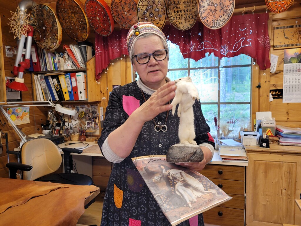 Wegen der strengen Winter wachsen hier die Bäume im Zeitlupentempo. Irene Kangasniemi zeigt mir in ihrem Atelier ein Stück vom Stamm einer arktischen Pinie. Was für mich wie ein Ast aussieht, brauchte dafür 210 Jahre. Aus diesem Holz, Tierfellen und -knochen stellt die Künstlerin hochwertige Werkzeuge und Souvenirs her. Hier darf ich sogar selber Hand anlegen und mir einen Schlüsselanhänger basteln, der mich fortan an den unvergesslichen Sommer in Lappland erinnert.