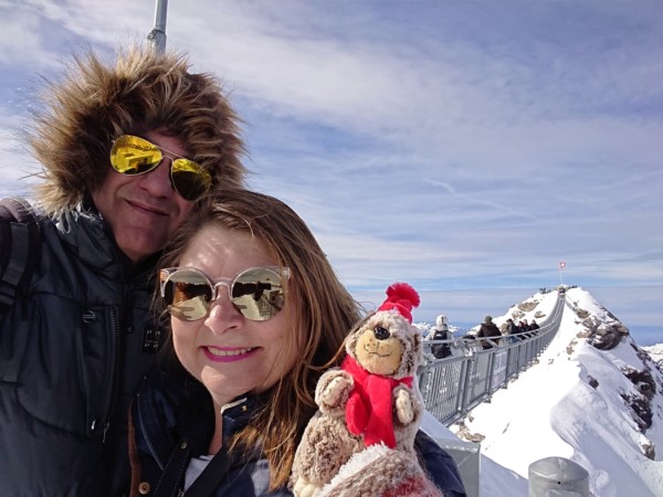 Georg und Barbara Blunschi vor dem Peak Walk by Tissot auf dem Galcier 3000.