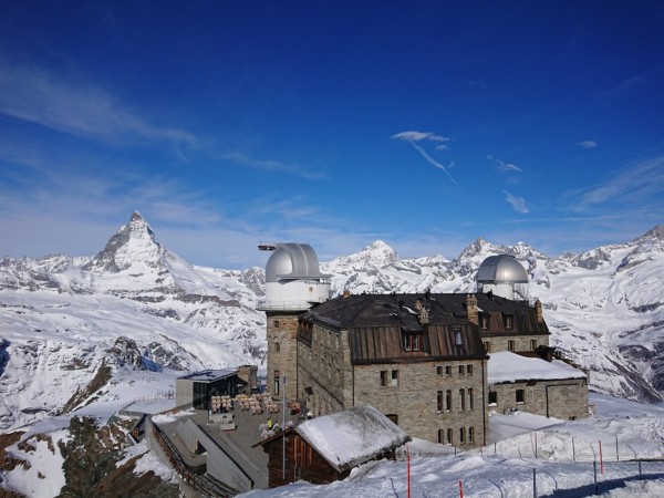 Hochalpines Panorama über die Bergstation Gornergrat und das Matterhorn.