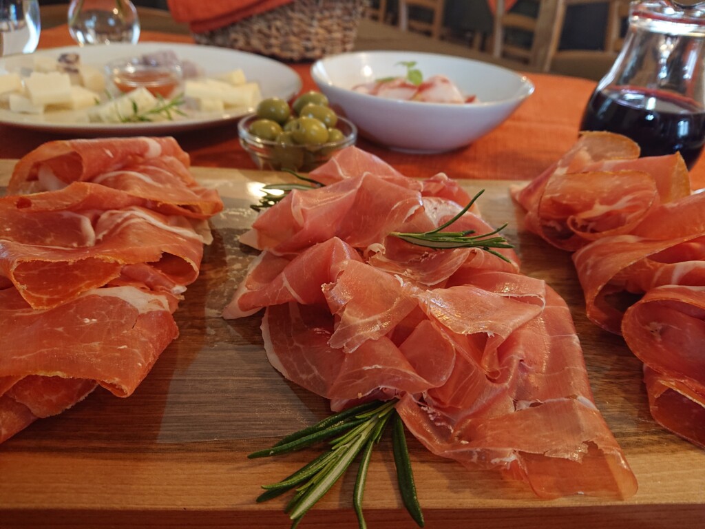 Der böige Fallwind erreicht Windgeschwindigkeiten bis zu 150 km/h und bläst besonders stark durchs Vipava-Tal. Wegen der Bora werden die Hausdächer zusätzlich mit schweren Steinen beschwert. Sie sorgt aber auch für die Trocknung einer köstlichen Spezialität. In Tomaj durfte ich einen Blick in den familiengeführte Betrieb Škerlj werfen und den Schinken ausprobieren.