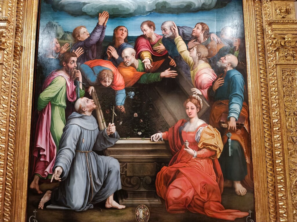 Ein Hingucker ist auch das besonders farbenfrohe Gemälde des Künstlers Raffaellino del Colle. Es zeigt die Krönung der Jungfrau Maria mit den Aposteln, der Heilige Franziskus von Assisi und die Heilige Maria Magdalena.