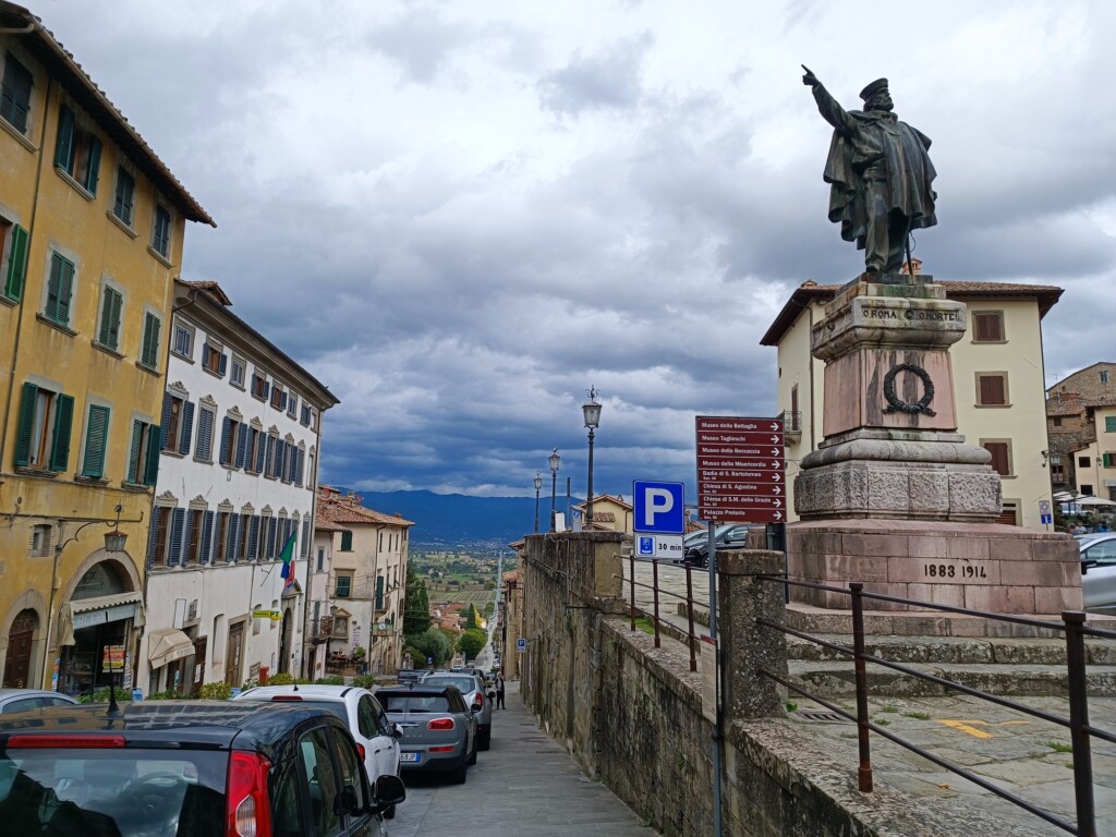 Auf einem felsigen Hang thront die mittelalterliche Kleinstadt über dem oberen Tibertal. Vom in der Ebene gelegene Sansepolcro ist sie nur ein Katzensprung entfernt. Dorthin blicken wir zurück vom Hauptplatz von Anghiari mit dem Garibaldi-Denkmal.